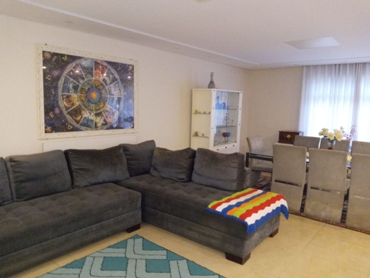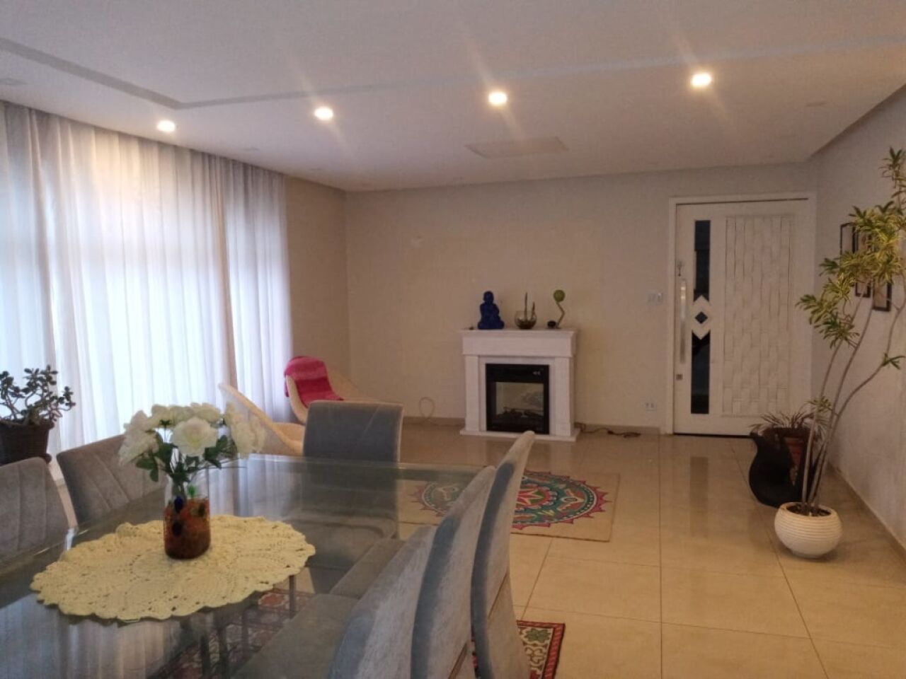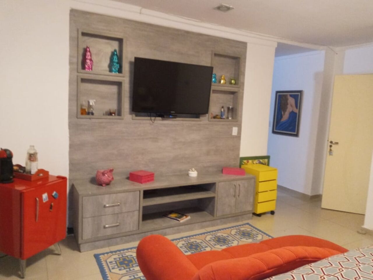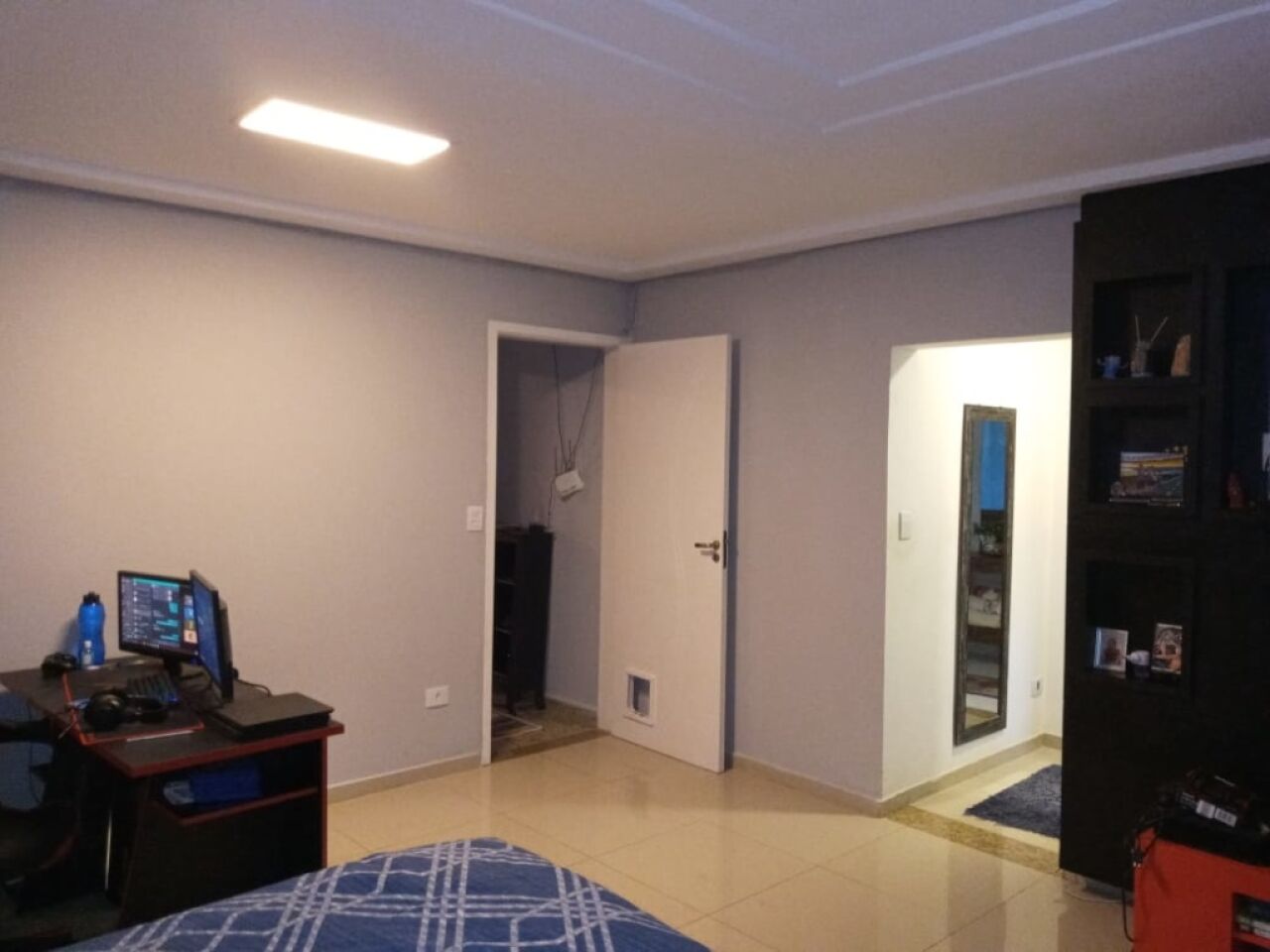 Sala ampla com porcelanato, sanca de gesso no teto.