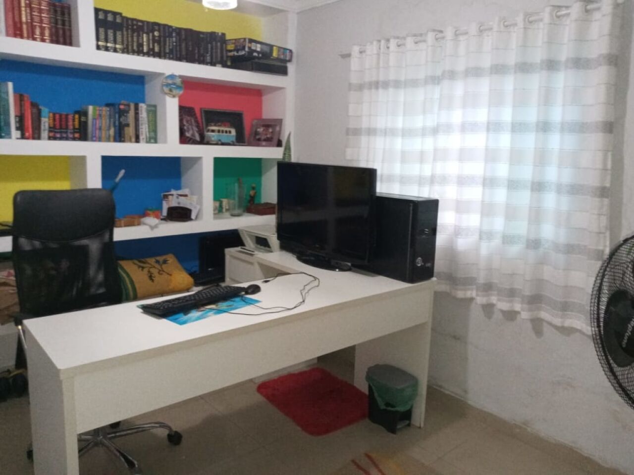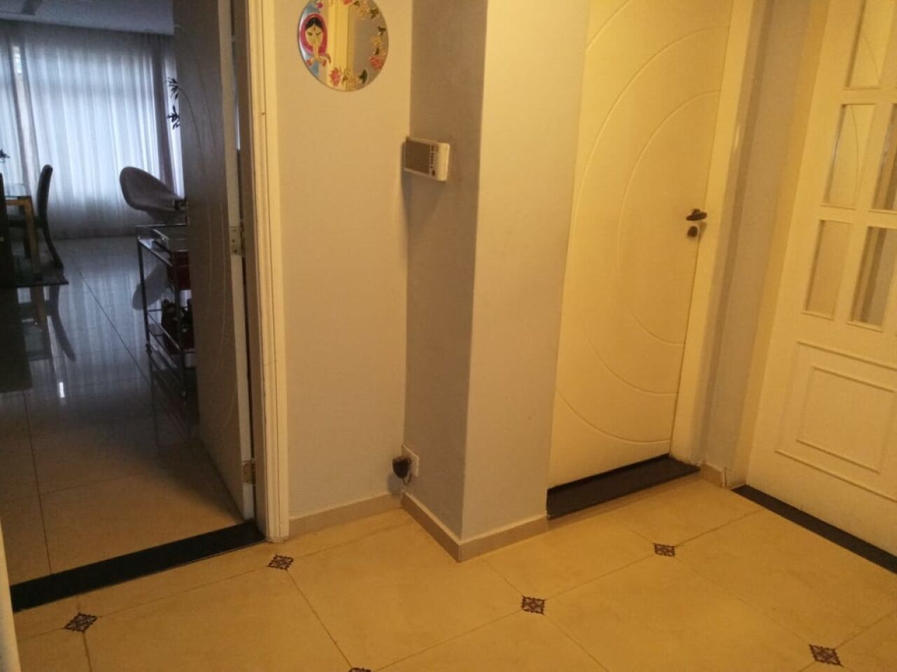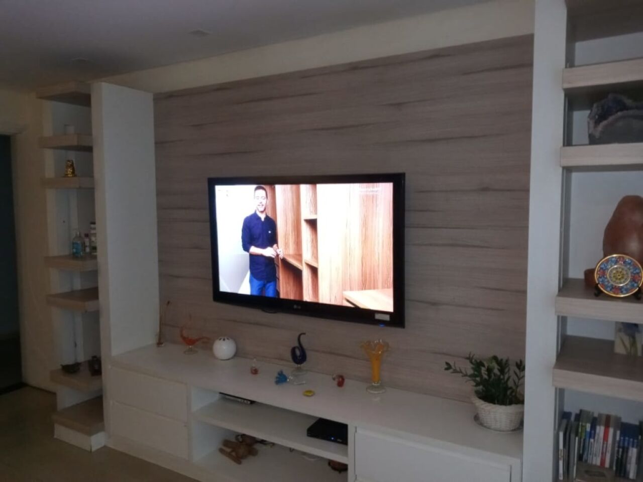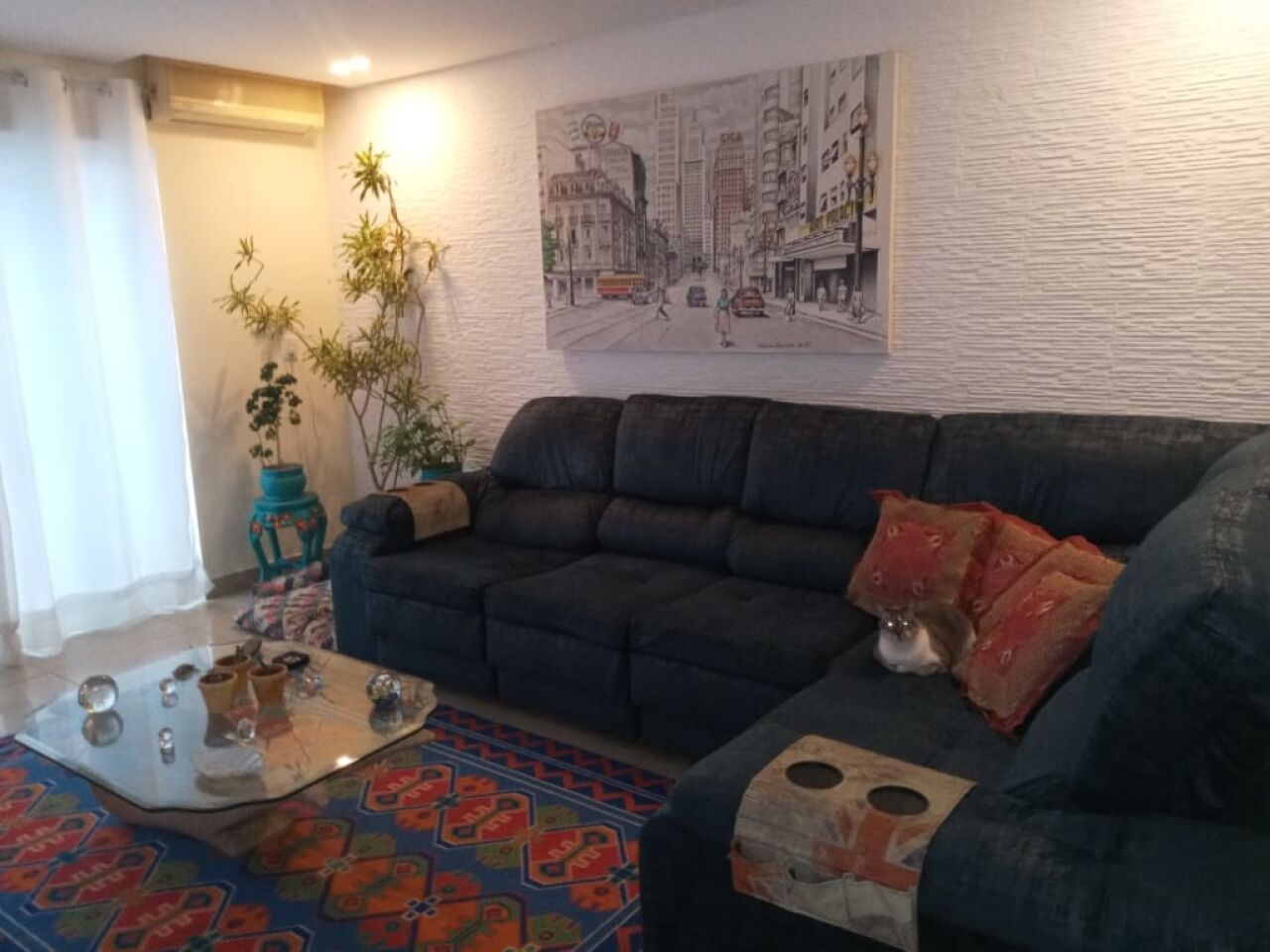 Sala ampla com porcelanato, sanca de gesso no teto.